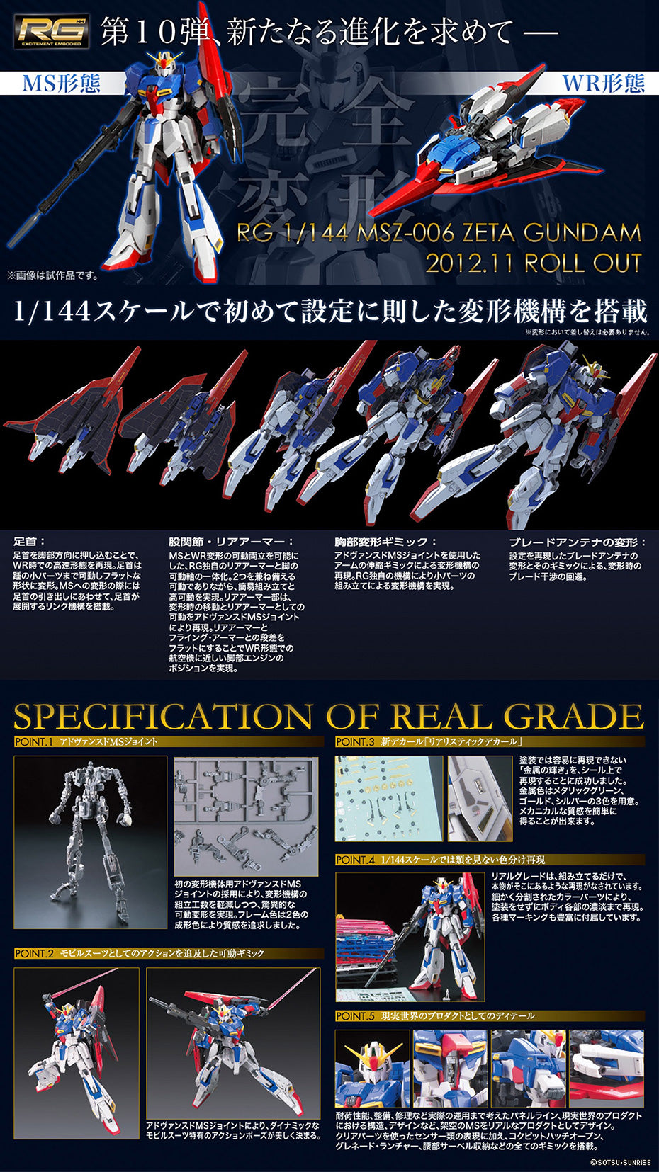 Bandai markede deres tiende udgivelse i RG serien med den storslåede Zeta Gundam. I MG og PG serierne transformerede Zeta sig til Wave Rider formen, og det store spørgsmål var om det også ville ske med RG, da de meldte ud at den ville komme. Det gør den. Ingeniørene har virkelig haft travlt med at udvikle en helt ny grænse for mobilitet.