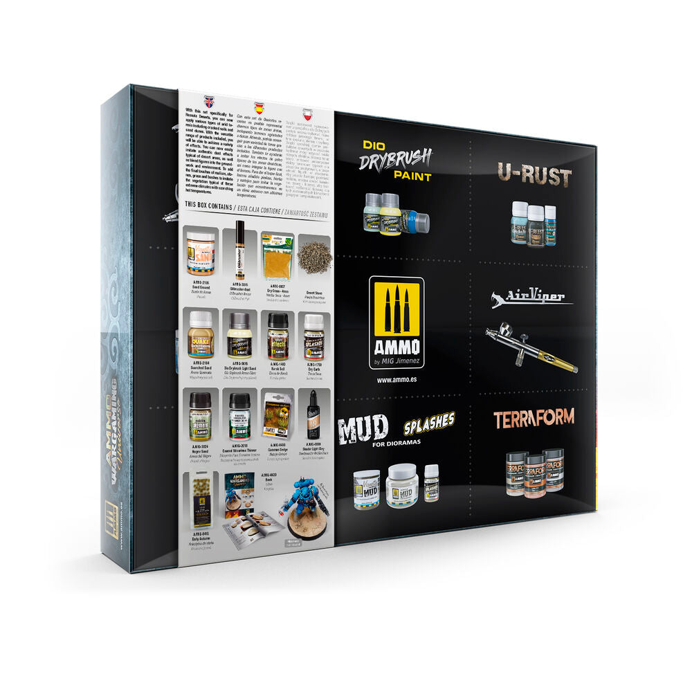 1 x AMMO WARGAMING UNIVERSE Book 01 ��� Remote Deserts (English, Castellano, Polski) (A.MIG-6920 / Glow2B 2074069201)1 x Sand Ground (A.MIG-2156 / Glow2B 2074021568)1 x PIGMENT Negev Sand (A.MIG-3024 / Glow2B 2074030249)1 x DRYBRUSH Light Sand (A.MIG-0616 / Glow2B 2074006169)1 x SHADER Light Clay (A.MIG-0869 / Glow2B 2074008699)1 x Common Sedge (A.MIG-8456 / Glow2B 2074084563)1 x OILBRUSHER Dust (A.MIG-3516 / Glow2B 2074035169)1 x Kursk Soil EFFECTS (A.MIG-1400 / Glow2B 2074014003)1 x SPLASHES Dry Earth (A.MIG-1750 / Glow2B 2074017509)1 x QUAKE CRACKLE CREATOR TEXTURES Scorched Sand (A.MIG-2184 / Glow2B 2074021841)1 x Two Coloured Tufts - Early Autumn (A.MIG-8415)1 x Dry Grass ��� 4mm (A.MIG-8807 )1 x Enamel Odourless Thinner (35mL) (A.MIG-2018 / Glow2B 2074020189)