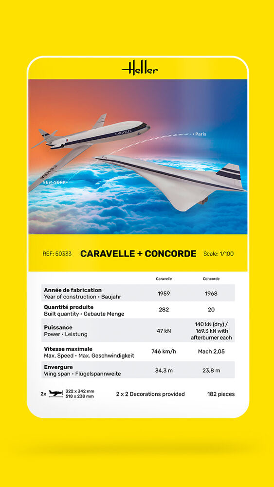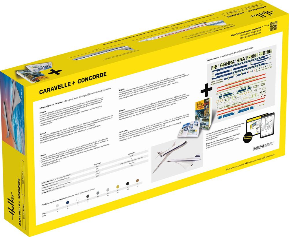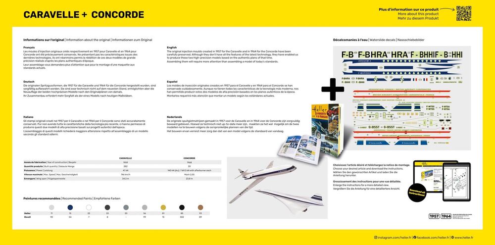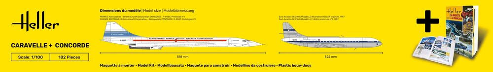 The original injection moulds created in 1957 for the Caravelle and in 1964 for the Concorde have been carefully preserved. Although they don't have all the features of the latest technology, they have enabled us to produce these two high-precision models based on the authentic plans of that time.Assembling them will require more attention than assembling a model of today's standards.Incl. book by Jean-Christophe Carbonel on the history of the Heller brand.